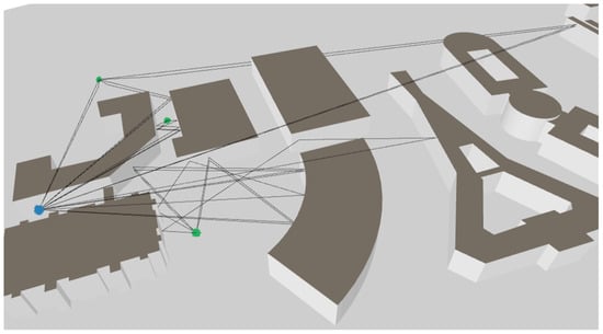 Signal propagation in the campus scenario without RIS deployment. Due to the absence of controllable reflections, most users in shadowed areas are served only by weak or obstructed multipath components, resulting in limited coverage and degraded link quality. The blue marker denotes the transmitter, while the green markers represent receivers.