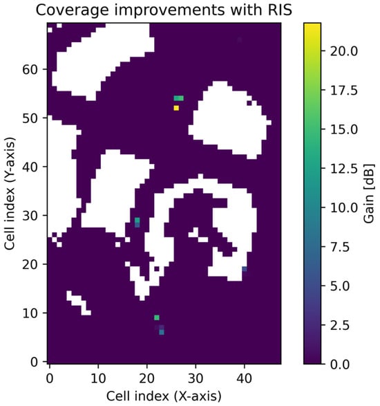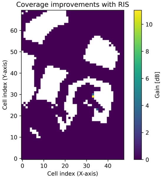 This visualization provides an intuitive interpretation of the RIS effect, complementing the quantitative evaluations presented in the following subsections. Specifically, it highlights how RIS transforms the propagation environment from one with limited and weak multipath connectivity into one with enhanced link diversity and stronger constructive signal components.
