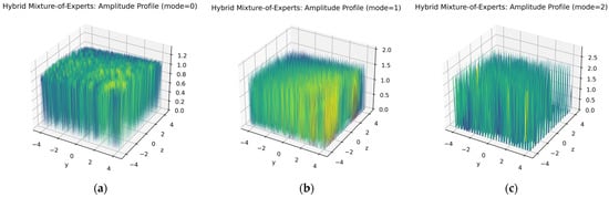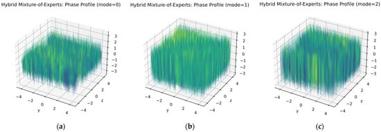 In contrast, the CNN-based gating maps (Figure 20) exhibit a more deterministic and sharply defined allocation pattern. For all three modes, the α values are concentrated near the maximum (close to 1.0) across large contiguous regions of the RIS, with only sparse patches receiving minimal weighting. This binary-like structure indicates that the convolutional network enforces a strong specialization of RIS sub-regions, effectively turning “on” or “off” elements in accordance with the learned spatial features. Compared to the smoother transitions observed in the Hybrid MoE, the CNN-based approach demonstrates a higher degree of structural regularity and rigidity in its gating assignments.