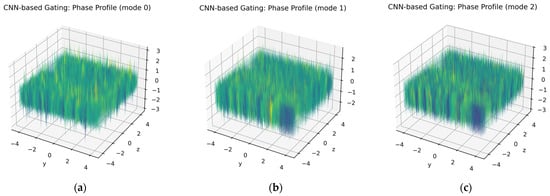 Phase profiles of the RIS elements obtained with the FL strategy. The panels show the optimized phase distribution across the RIS surface for different propagation modes: (a) mode 0; (b) mode 1; (c) mode 2. The color scale represents the phase values within the interval , where brighter colors correspond to phase values close to and darker colors correspond to values near , highlighting how the method manipulates phase shifts to achieve constructive signal combination and improved coverage for user-specific channel conditions.