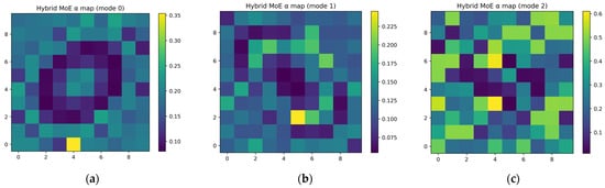 Heatmaps of the learned values for the MoE method: (a) mode 0, showing a relatively balanced allocation with localized emphasis; (b) mode 1, where the distribution becomes more polarized with distinct patches of higher contribution; and (c) mode 2, highlighting dominant sub-regions that receive substantially higher weights, reflecting selective reinforcement of specific spatial areas.