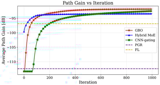 Average path gain versus iteration for different RIS configuration strategies. Analytical baselines (PGR, FL) remain constant, while optimization-driven methods (GBO, Hybrid MoE, CNN) demonstrate significant iterative improvements. GBO achieves the highest final path gain (≈−92 dB), Hybrid MoE converges near −93.5 dB, and CNN reaches ≈ −94 dB after a slower start, highlighting the trade-off between convergence speed, adaptability, and interpretability across methods.