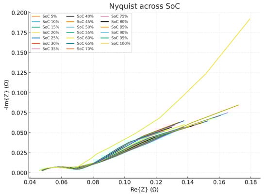 Aggregated Nyquist plots across SOCs from cell’s EIS data in [].