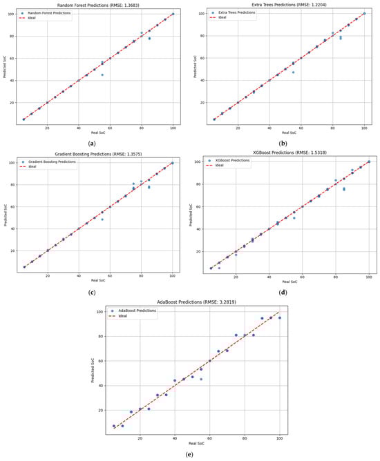 Predicted vs. actual SoC performance results for all five models. Each subplot corresponds to one model. The red dashed diagonal line in each plot represents the ideal prediction (perfect accuracy). (a) Random Forest (RF); (b) Extra Tree; (c) Gradient Boosting; (d) Extreme Gradient Boosting; (e) Adaptive Boosting. Models whose points lie close to this line for all SoC values are highly accurate, whereas significant deviations from the line indicate prediction errors.