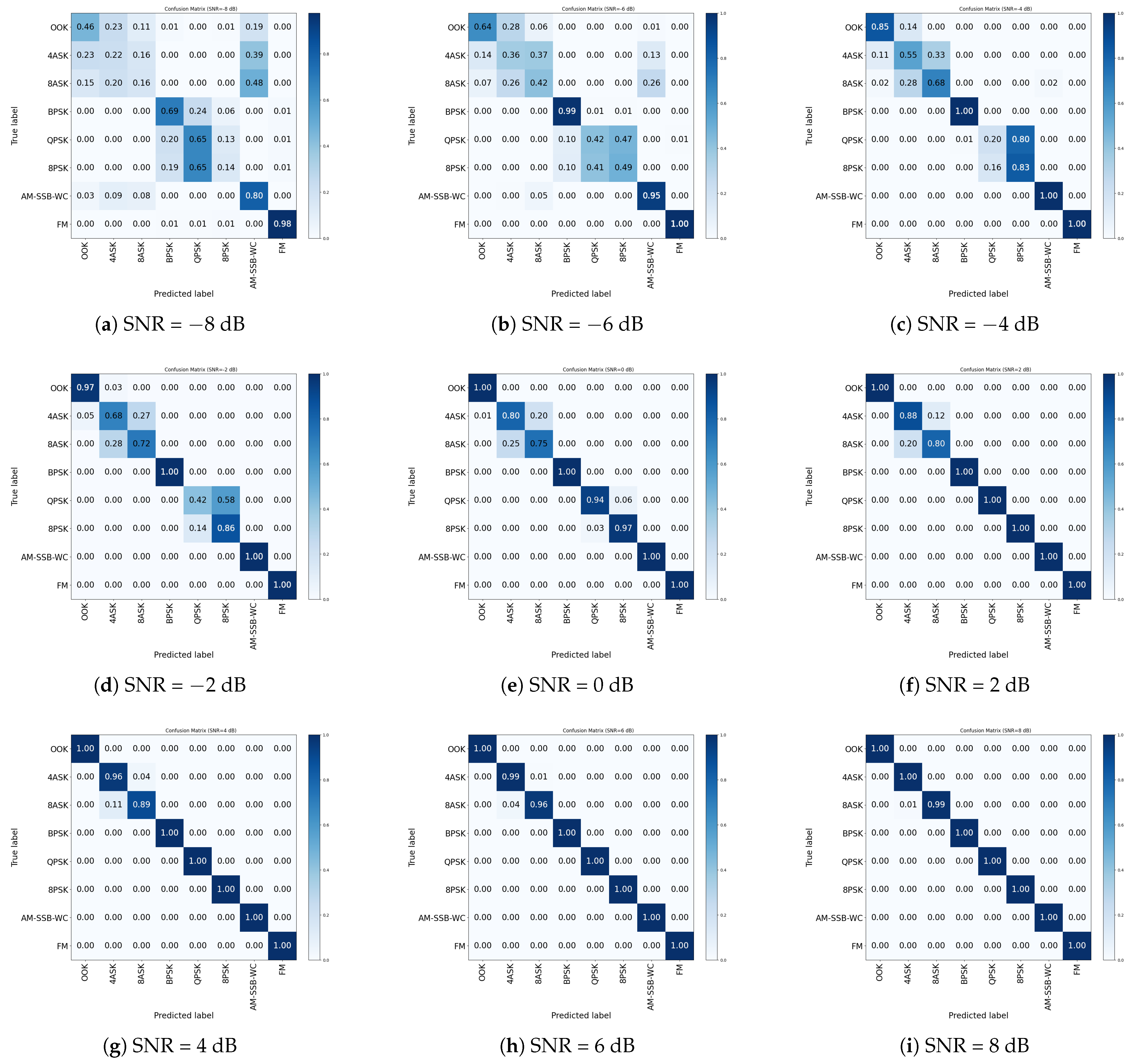 - Daldal, N.; Yıldırım, Ö.; Polat, K. Deep Long Short-Term Memory Networks-Based Automatic Recognition of Six Different Digital Modulation Types under Varying Noise Conditions. Neural Comput. Appl. 2019, 31, 1967–1981. [Google Scholar] [CrossRef]