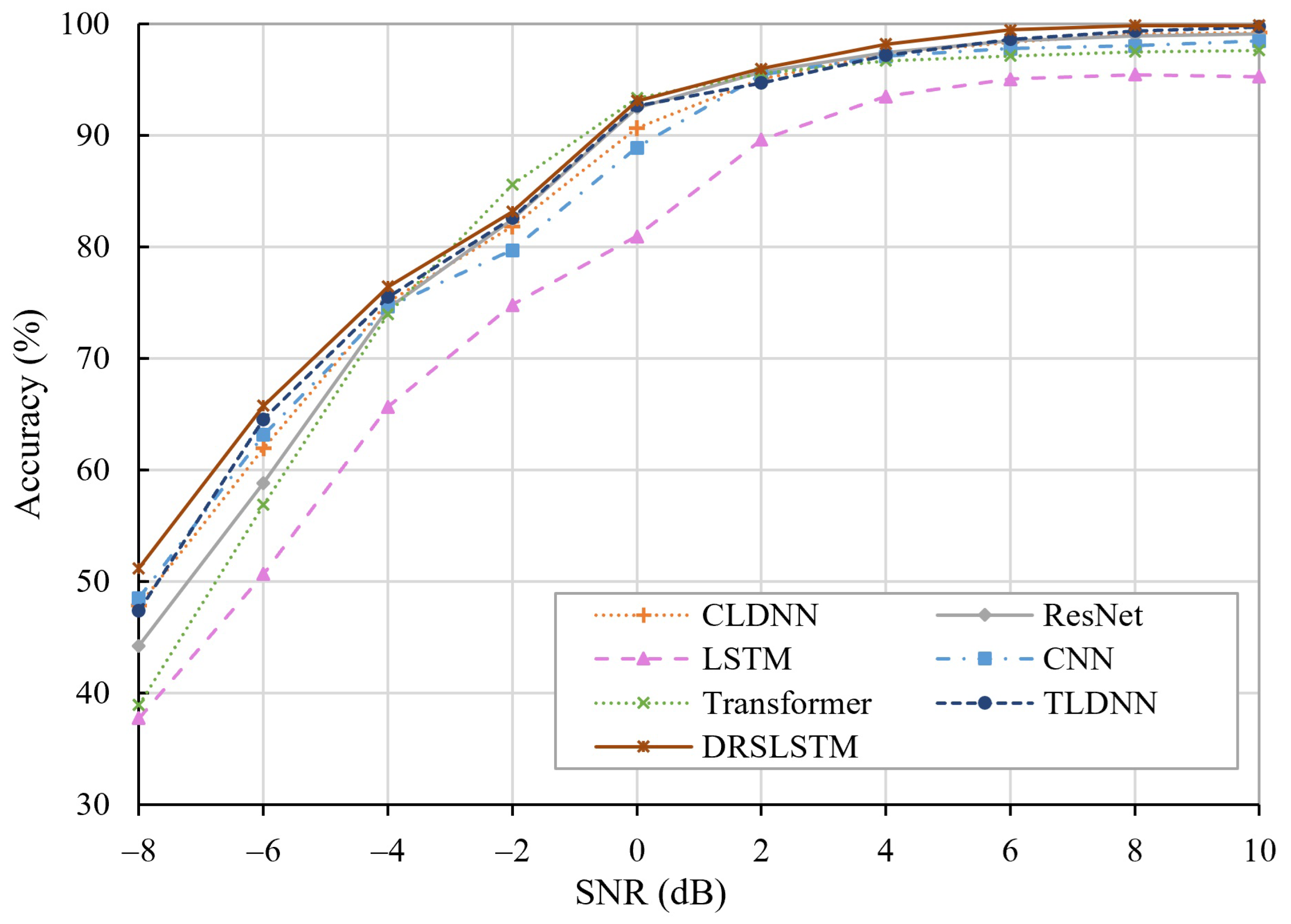 | SNR (dB) | CLDNN | Resnet | LSTM | CNN | Transformer | TLDNN | DRSLSTM |