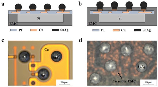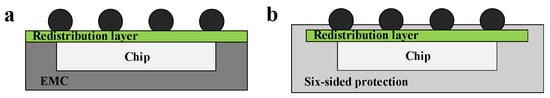 Figure 2a shows the normal structure. The chip is embedded within the EMC, with its front surface exposed. Two passivation layers and two redistribution layers are alternately arranged on the front surface of the chip, and solder balls are interconnected with the redistribution layers. The six-sided protective structure is shown in Figure 2b. By contrast, an additional EMC layer covers the surface and surrounding side walls of the redistribution layer. And the solder balls interconnect with the redistribution layer via bumps that traverse the EMC layer. Figure 2c,d demonstrate the top view of the redistribution layer in the two packaging structures. It can be seen that the redistribution layer in normal structures is directly observable, whereas in six-sided protective structures, the redistribution layer (RDL) is covered by the EMC and is no longer clearly visible. Such a design can offer a degree of protection to the redistribution layer, reducing performance degradation caused by surface scratches and other damage.