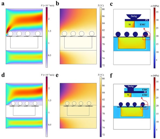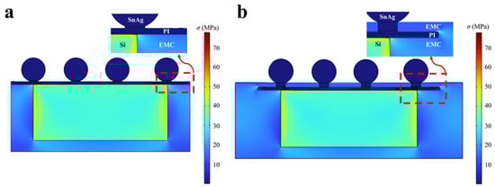 Figure 5a,b show the temperature and thermal stress variations for the normal structure and the six-sided protective structure. Figure 4a shows the average thermal stress variation trend under heating and cooling conditions from −50 °C to 150 °C. The stress varies linearly with temperature, based on a given temperature. Within this temperature range, the thermal stress of the six-sided protective structure decreases by 7.85% compared with the normal structure, and the stress change rate does not change with temperature. Figure 5b shows the temperature and average thermal stress variations for the entire package within the Si region’s heating power range of 0–3.5 × 106 W/m3. As the heating power increases, the temperature and thermal stress of the six-sided protective structure decrease more significantly compared to the normal structure. At a power of 3.5 × 106 W/m3, the temperature of the six-sided protective structure decreases by 1.21%, and the average thermal stress decreases by 9.17%. A thicker stress buffer layer would enhance reliability [29]. In the six-sided protective structure, the upper protective layer for the front-side RDL acts as a stress buffer layer. The thickness of the upper protective layer affects the protective performance. The specific data is shown in Figure 5c. The thermal stress of the overall structure decreases linearly with the increase in the thickness of the upper layer. As the thickness of the upper layer increased from 20 µm to 60 µm, the thermal stress decreased by 2.57%. Compared to normal structures, the introduction of an additional EMC layer can reduce internal stresses arising from CTE mismatch, thereby enhancing reliability.