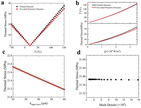 (a) Average stress variation of normal structure and six-sided protective structure in the range of −50 to 150 °C. (b) Changes in average temperature and average stress of the two structures under different heating powers. (c) The average stress variation of the thickness of the upper protective layer of the six-sided protective structure. (d) The average stress variation of mesh density.