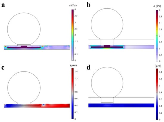 In the stress concentration zones, the stress in the six-sided protective structure is uniformly distributed around the electrode. In contrast, the stress in the normal structure diffuses from the electrode to the interior and surface of the PI layer. The stress distribution in the normal structure is uneven, and the maximum stress value is much greater than that in the six-sided protective structure, as shown in Figure 6a,b. Furthermore, due to the lack of a protective layer, the PI layer in the normal structure exhibits significant upward warping, reaching an amplitude of 1.5 µm, while the PI layer in the six-sided protective structure shows almost no deformation, as shown in Figure 6c,d. This demonstrates that the hexagonal protective structure possesses superior thermal stability.