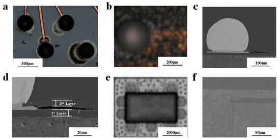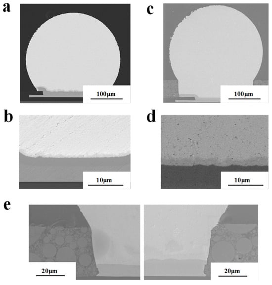 The microstructure of the packaging structure was investigated using cross-sectional SEM. In normal structures, solder balls are uniformly dense and rounded, with an intermetallic compound (IMC) layer that is compact and measures between 0.5 μm and 1.4 μm in thickness (Figure 8a,b). Similar microstructures were also observed in the six-sided encapsulation structure, with an IMC layer thickness ranging from 0.7 μm and 1.6 μm (Figure 8c,d). Owing to the characteristics of the six-sided protective structure, the solder balls are partially embedded within the EMC. Consequently, we measured the bonding state between the solder balls and the EMC. From Figure 8e, we can clearly observe the interface between the solder ball and the EMC, which exhibits a tight bond with no delamination. The results above indicate that the solder ball performance remains acceptable after introducing an EMC layer for surface protection within the packaging structure.