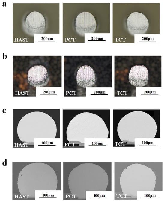 To elucidate the contribution of EMC to enhancing reliability performance, we designed reliability tests related to humidity and heat. Following the sample pre-treatment, HAST, PCT, and TCT were conducted, respectively. We employed shear force testing and SEM to investigate the reliability differences between normal structures and six-sided protective structures. After the reliability test ended, shear 25 solder balls and record the corresponding shear force (Table 3). It can be observed that the shear force of the solder balls in both structures has decreased slightly [32], but remains within an acceptable range. Moreover, compared to the normal structure, both the minimum value in the TCT and the average value in the PCT are slightly lower in the six-sided protective structure. This may be related to the uniformity of solder ball preparation, as shear force values are influenced by temperature fluctuations [33]. Solder ball formation is performed through wafer-level reflow. During the reflow process, temperature variations across different regions of the wafer cause differences in the reflow temperature profiles of the solder balls, which consequently affect the shear force values. The failure modes of solder balls before and after reliability testing were similar, with fractures located inside the solder balls (Figure 10a). The SEM image of the solder ball after reliability testing is shown in Figure 10c. In the normal structure, the IMC layer remains in a dense state, though its thickness has increased slightly. The same phenomenon occurs in the six-sided protective structure, with the corresponding failure modes and SEM images shown in Figure 10b,d, respectively.