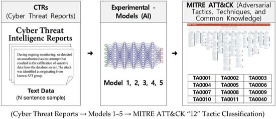 The rcATT dataset (Legoy et al., 2020) was used for experiments [4]. This dataset contains 1490 publicly available threat reports, with each document having a multi-label structure assigned one or more of 12 MITRE ATT&CK tactic labels (TA0001~TA0011, TA0040). Each model vectorizes document representations and then predicts tactic labels using a multi-layer perceptron (MLP) or classifier [9]. All models are designed with a multi-label classification structure, enabling simultaneous detection of multiple tactics within a single document [17]. The final output is document-level prediction results for the 12 MITRE ATT&CK tactic classes [14]. The experiment proceeded with the following workflow: input data (cyber threat reports) on the left, the AI model in the centre, and the tactic classification results on the right [24].