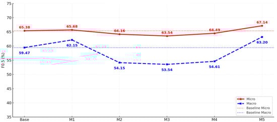 Furthermore, the results of this study quantitatively demonstrate the potential to reduce analyst workload in SOC environments. As shown in Table 6 and Figure 8, Model 5 (TF-IDF ⊕ BERTopic) outperformed the baseline rcATT model in all metrics, achieving Precision = 66.59%, Recall = 57.49%, and F0.5 = 67.14%. These improvements suggest that the model can enhance alert reliability and reduce false positives, thereby mitigating alert fatigue and improving operational efficiency within SOC workflows. In particular, the gain in precision helps decrease unnecessary alerts, allowing analysts to focus on higher-priority incidents rather than repetitive triage tasks. This finding is also consistent with the POMDP (Partially Observable Markov Decision Process)–based cybersecurity risk model proposed by Donchev et al. (2021) [37], which reported that when the false-positive rate exceeds approximately 20–25%, the effect of risk reduction reaches saturation. Hence, reducing false positives—i.e., improving precision—directly contributes to both operational and security risk mitigation. In this context, the proposed model presents a hypothetical yet technically grounded potential to alleviate analyst workload through precision improvement and false-positive reduction. However, since this study did not include user studies, deployment trials, or practitioner feedback, its industrial relevance remains at a hypothetical level. Therefore, future work will focus on conducting empirical validations to establish concrete evidence and to demonstrate the model’s industrial applicability in real SOC environments.