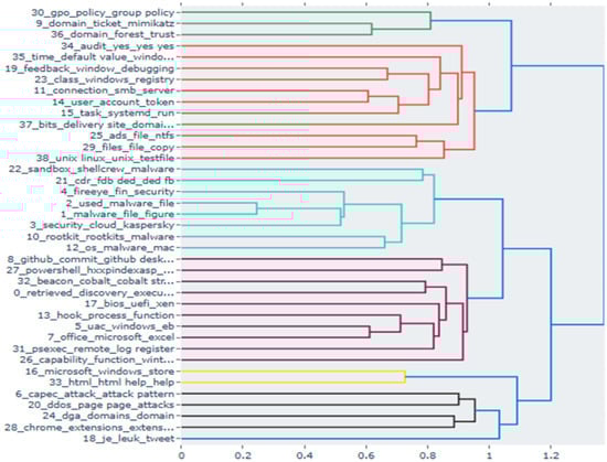 Finally, BERTopic was adopted to provide topic-level abstraction and improve interpretability. Using class-based TF-IDF (c-TF-IDF), BERTopic clusters semantically related reports and identifies key topic keywords—such as “Mimikatz,” “PowerShell,” and “Cobalt Strike”—that align with MITRE ATT&CK tactics. In this study, each topic identifier was converted into a 40-dimensional one-hot vector, providing a lightweight categorical feature that represents high-level thematic patterns of CTI data.