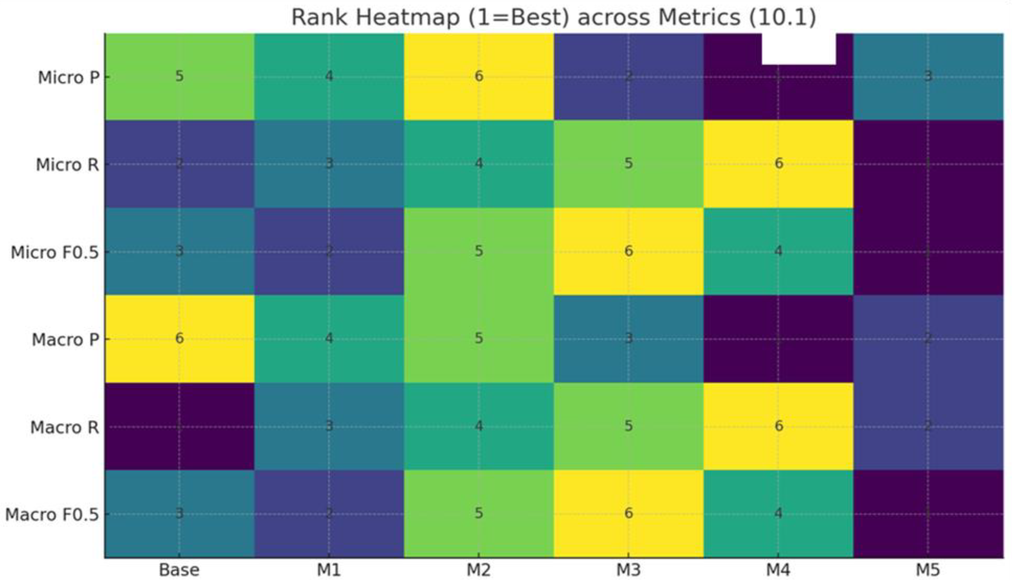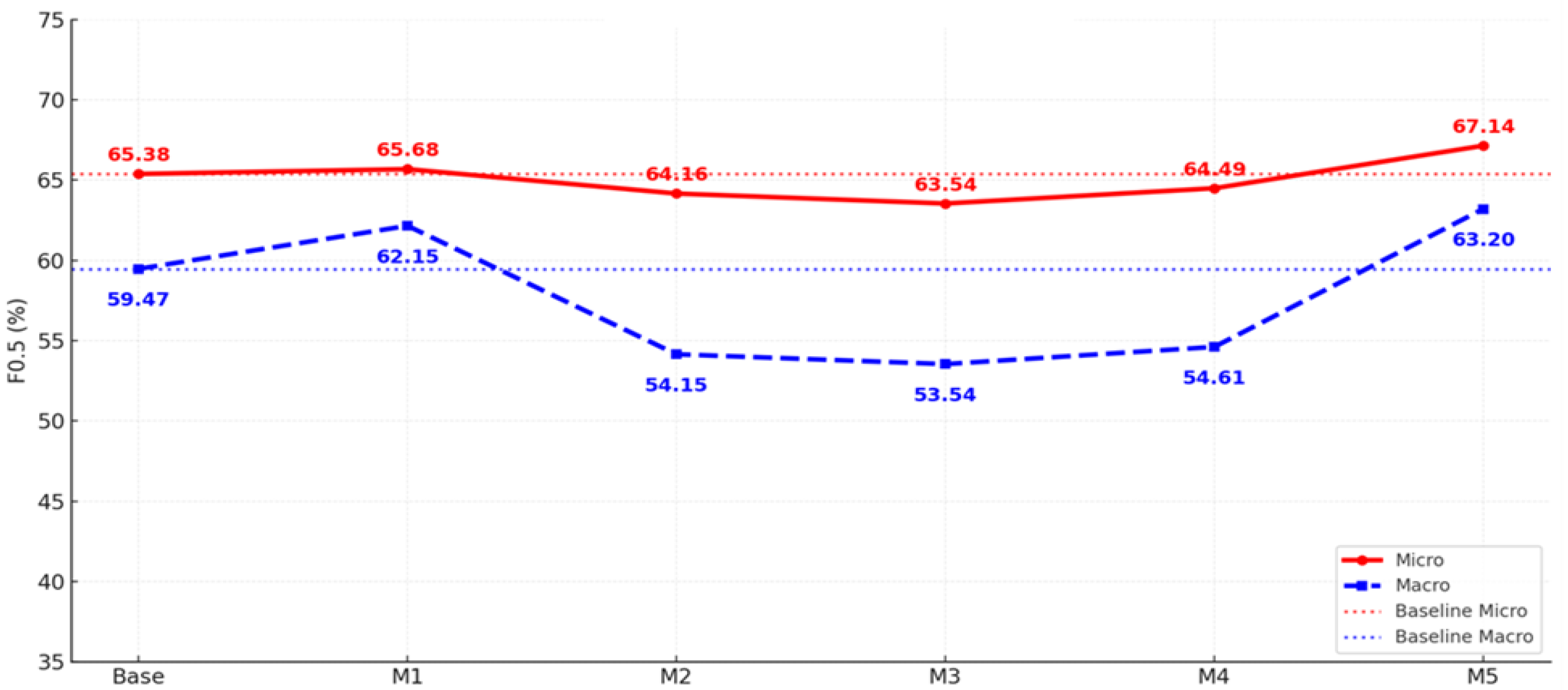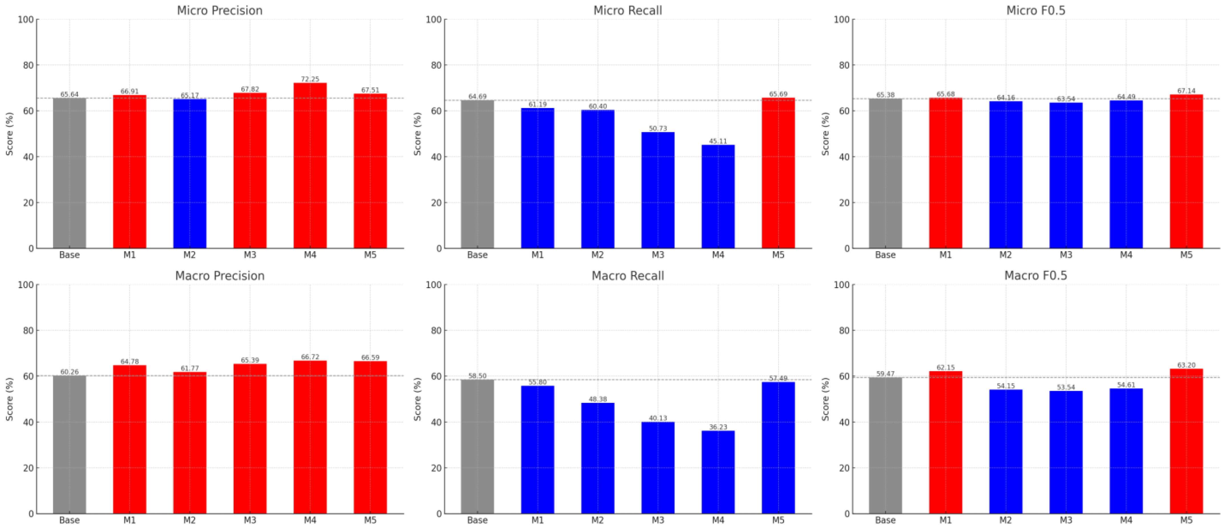 | Experimental Model | Metric Avg. | Precision (%) | Imp. (%) | Recall (%) | Imp. (%) | F0.5 (%) | Imp. (%) | ||