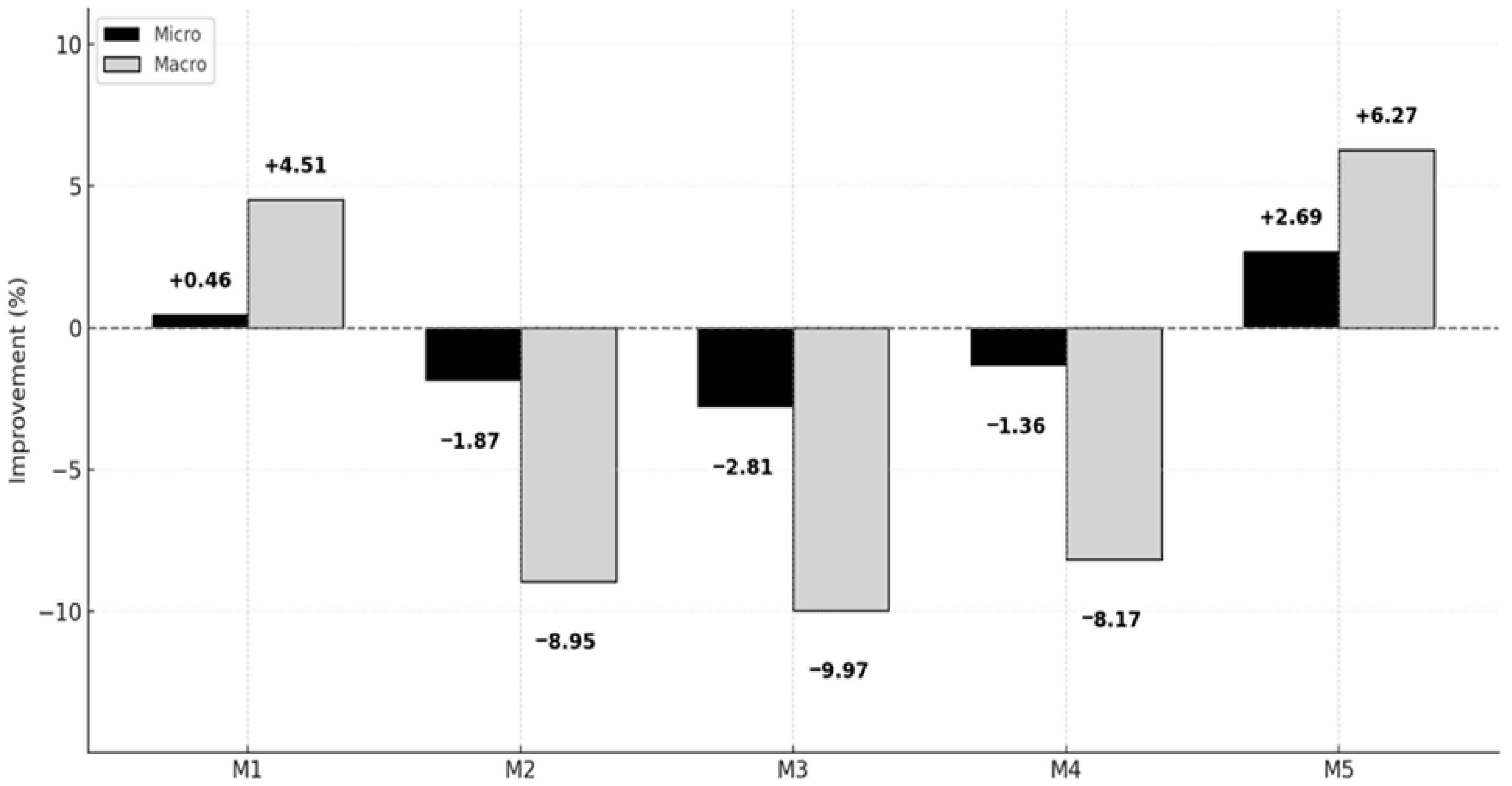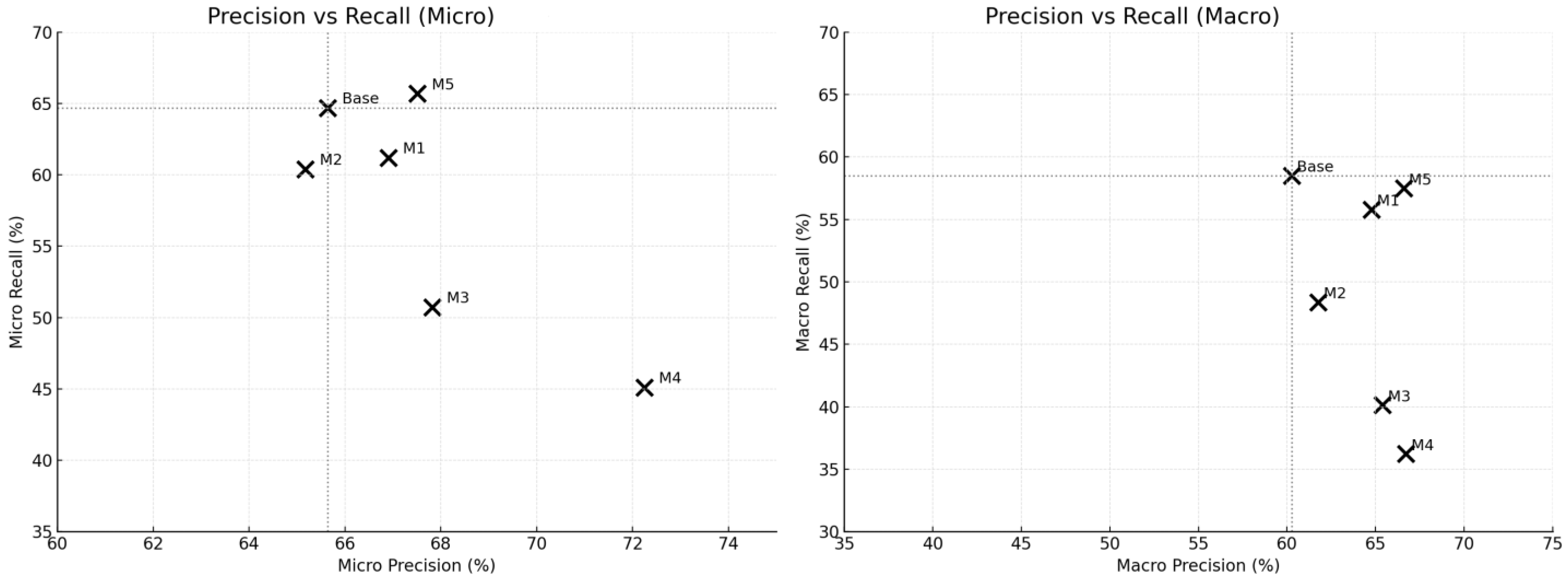 | Model-4 | TF-IDF + ModernBERT | MLP | Micro | 72.25 | +10.07 | 45.11 | −30.27 | 64.49 | −1.36 |