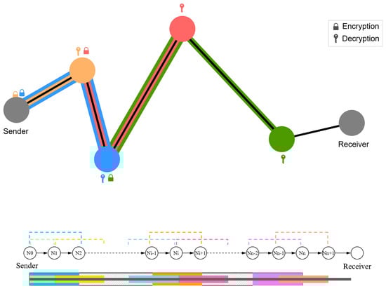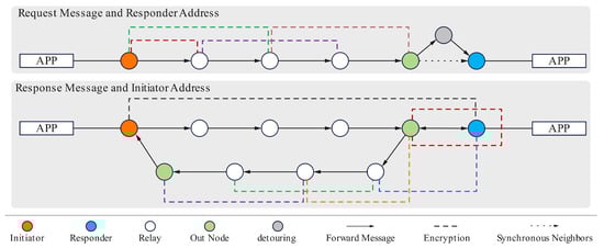 - Double encryption of initiator information: Initiator data is encrypted first with a temporary key established during initialization and then with a temporary key from the last hop. Upon decryption by the responder, it is re-encrypted for the return path, ensuring confidentiality throughout bidirectional anonymous communication.