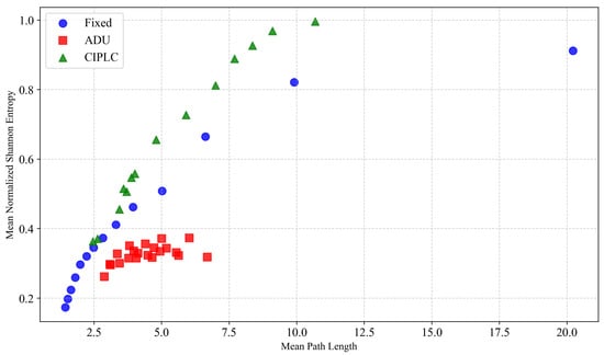 First, in terms of anonymity (Section 4.1 and Figure 6), both CIPLC and the Fixed scheme achieve significantly higher normalized Shannon entropy than ADU. ADU optimizes path-length variance but introduces explicit control parameters (e.g., M, e, ), leaking path information and weakening resistance to predecessor attacks. CIPLC uses chaotic iterative functions to generate forwarding parameters (x), avoiding hop-count/probability leakage and preserving anonymity comparable to the Fixed scheme—even slightly enhancing entropy in some configurations.