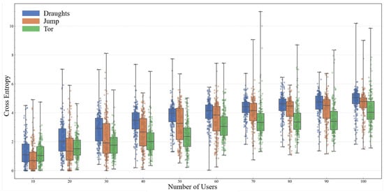 Experimental result: comparison of cross-entropy across Draughts, Jump, and Tor as the number of participating users varies.