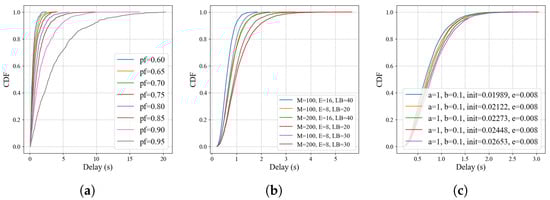 For the CIPLC algorithm, we set the parameter for all test groups to enhance the randomness of iterations, where b represents the range of each perturbation applied during iterations, and denotes the threshold for terminating the random walk. As reflected in Figure 10c, CIPLC exhibits a delay distribution that is comparable to ADU in terms of concentration. Its strong performance stems from rapid convergence: while the initial value of the iteration and its proximity to the asymptote of the iteration function affect the number of iterations, the applied perturbations ensure that once an iteration approaches the horizontal axis, the process converges quickly and terminates forwarding. This rapid transition from random iteration to convergence avoids overly long paths, resulting in tightly clustered delay distributions.