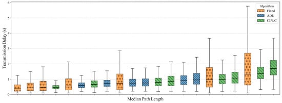 To further compare the delay distribution characteristics across all algorithms and parameter combinations, we sorted all test groups by their median path length and plotted the transmission delay distribution as a boxplot (Figure 11). As observed from the figure, all algorithms exhibit increased delay dispersion as the average path length increases—this is an inherent trend in random walk-based systems, as longer paths introduce more uncertainty in cumulative delay. However, when different algorithms have similar average path lengths, both ADU and CIPLC demonstrate significantly better delay control: their delay variances are much smaller than that of the Fixed algorithm, which confirms the superiority of ADU and CIPLC in suppressing delay inhomogeneity.