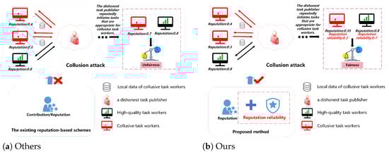 In reputation-based FL, reputation serves to evaluate the trustworthiness of task workers; task workers with higher reputations have more chances to participate in future tasks. However, when collusive task workers collude with dishonest task publishers, a mechanism can be devised to destroy this assessment. Specifically, collusive task workers may share their private local data with task publishers. Then, unreliable publishers design tasks tailored to the local data of these task workers to make collusive task workers complete them flawlessly, thus “legitimately” enhancing their reputation. If the unreliable publisher repeats tailored tasks, the collusive worker’s reputation will continually rise to give them more opportunities to take part in future tasks and accrue more rewards. Such collusion increases the training time and compromises the model’s accuracy. Moreover, it destroys the system’s integrity, denying honest task workers, who truly provide high-quality work, their due incentives and diminishing their motivation to take part in future tasks, as shown in Figure 1. Consequently, there is an urgent need for a method to defend against collusion attacks to ensure the reliability of FL.