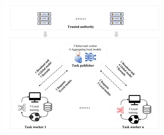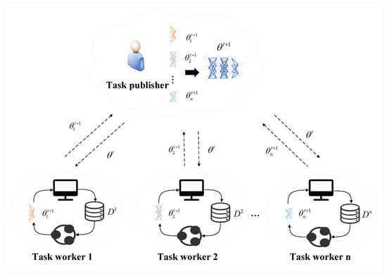 FL is a distributed machine learning approach that facilitates collaborative model training across multiple nodes (i.e., task workers), ensuring all training data remains on local devices [40]. This can preserve data privacy [41], given that it eliminates the need for centralized data storage or sharing and effectively harnesses data resources that are geographically dispersed [42], as follows Figure 2. A comprehensive depiction of all roles mentioned in the paper is provided in Table 2.