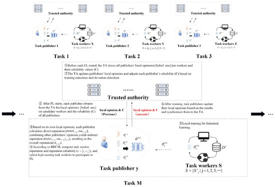 - Step 6: Complete the Task: Repeat Steps 2 through 6 until the global model reaches the predetermined accuracy target. Finally, TA updates reputation and reliability based on the performance of the task workers and task publishers in that round, respectively.
