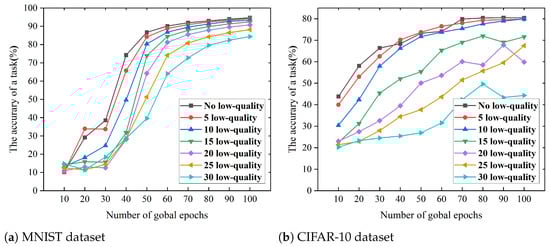 To evaluate the influence of low-quality task workers on the training dynamics of FL models, this study meticulously structured seven distinct experimental scenarios. These scenarios ranged from a baseline with no low-quality task workers to configurations including 5, 10, 15, 20, 25, and 30 low-quality task workers to capture the hierarchical impact of different numbers of low-quality task workers on the learning process. As illustrated in Figure 5, an obvious trend was observed: The participation of more low-quality task workers in a task proportionally reduces the accuracy of the model. This phenomenon highlights the detrimental effect of low-quality task workers on FL, emphasizing the importance of mitigating the influence of collusion attacks. For instance, in a scenario of no low-quality task workers, the accuracy of training models using MNIST and CIFAR-10 databases reached peaks of 94.69% and 80.53%, respectively. However, when the model was trained with the participation of 30 low-quality task workers, its accuracy sharply decreased to only 84.36% and 49.61%, respectively, marking a significant compromise in performance.