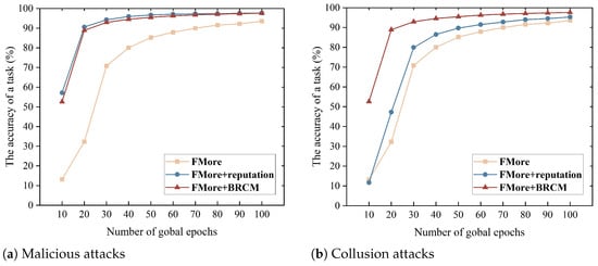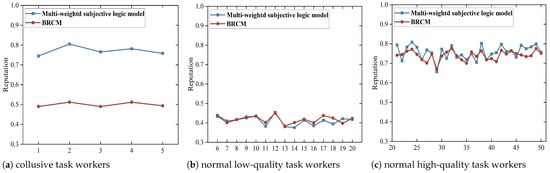 To substantiate the effectiveness of BRCM further, we conducted a comparative analysis of the reputation metrics between our proposed scheme and the multi-weight subjective logic model. As illustrated in Figure 7, under scenarios involving collusion between collusive task workers and unreliable publishers, the proposed scheme discernibly demarcates the reputation of collusive task workers (1–5) as lower than that determined by the multi-weight subjective logic model. The reputation of normal low-quality (6–20) and high-quality (21–50) task workers remains comparably consistent with those derived from the multi-weight subjective logic model. For instance, the reputation scores assigned to collusive task workers by the multi-weight subjective logic model and our method are 0.75 and 0.49, respectively. This discrepancy stems from the fact that the multi-weight subjective logic model overlooks the reliability of task publishers, presuming all to be trustworthy. In contrast, our method effectively defends against the collusion attack by diminishing the weight of the reputation that dishonest task publishers allocated to collusive task workers. Given the prevalence of collusion attacks in FL, our proposed scheme demonstrates enhanced suitability for device selection within this domain, offering a more robust and discerning approach than the multi-weight subjective logic mode.