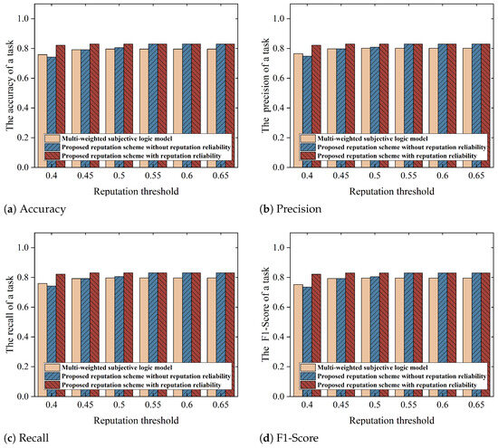 Specifically, when the threshold exceeds 0.5, the accuracy of the model under our proposed reputation scheme without reputation reliability is higher than the scheme utilizing a multi-weight subjective logic model. The difference stems from the fact that the multi-weight subjective logic model is unable to defend against collusion attacks. It will be influenced by false high praise provided by dishonest task publishers to collusive task workers to mistakenly choose collusive task workers to participate in the task. In contrast, our reputation scheme without reputation reliability effectively diminishes the weight of unreliable reputations through the use of a BUI aggregation model, creating a more authentic and precise system of reputation assessment for task workers. Furthermore, when the reputation threshold is set at 0.4, both our reputation scheme without reputation reliability and the multi-weight subjective logic model are unable to prevent collusion attacks, as all task workers (collusive, normal low-quality, and high-quality task workers) have reputations exceeding the threshold. However, in our reputation scheme with reputation reliability, when the reputation threshold is kept at 0.4 and the reputation reliability threshold is set at 0.59 or higher, the accuracy of the model significantly improves further. This is because setting a high threshold for reputation reliability can effectively prevent collusive task workers from being selected. So, introducing the reputation reliability threshold effectively filters out collusive task workers and enhances the model’s performance.