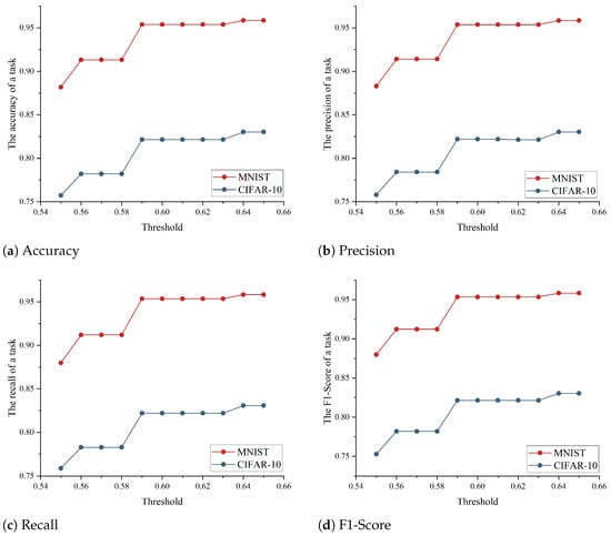 To explore the impact of threshold settings on the accuracy of an FL task, our study tested the accuracy of the model for different schemes under a variety of threshold conditions. In this experiment, we employed the hold-out cross-validation method, where the MNIST dataset with 60,000 training images was randomly divided into 80% training data (48,000 images) and 20% testing data (12,000 images) to evaluate the generalization performance of the federated learning model. Figure 8, Figure 9 and Figure 10 illustrate that setting reputation and reputation reliability thresholds reasonably in the proposed scheme can improve the accuracy of FL tasks.