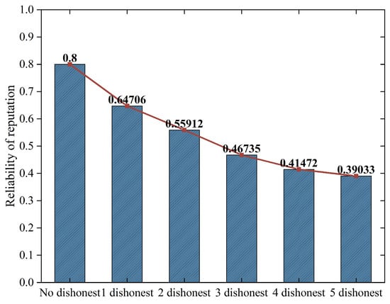 To verify the feasibility of the proposed scheme under different degrees of collusion, this study designed six experimental scenarios: scenarios with task workers not colluding with dishonest task publishers, task workers colluding with a dishonest task publisher, task workers colluding with two dishonest task publishers, task workers colluding with three dishonest task publishers, task workers colluding with four dishonest task publishers, and task workers colluding with five dishonest task publishers. As shown in Figure 11, the more publishers collude with unreliable tasks, the lower the reputation reliability of collusive task workers. For example, the reputation reliability of normal low-quality tasks is 0.8, but the reputation reliability of collusive task workers colluding with five dishonest task publishers is only 0.39. This is because the reputation reliability of task workers is the average aggregation of the reliability of task publishers, so the more malicious task publishers collude with task workers, the lower the reputation reliability.