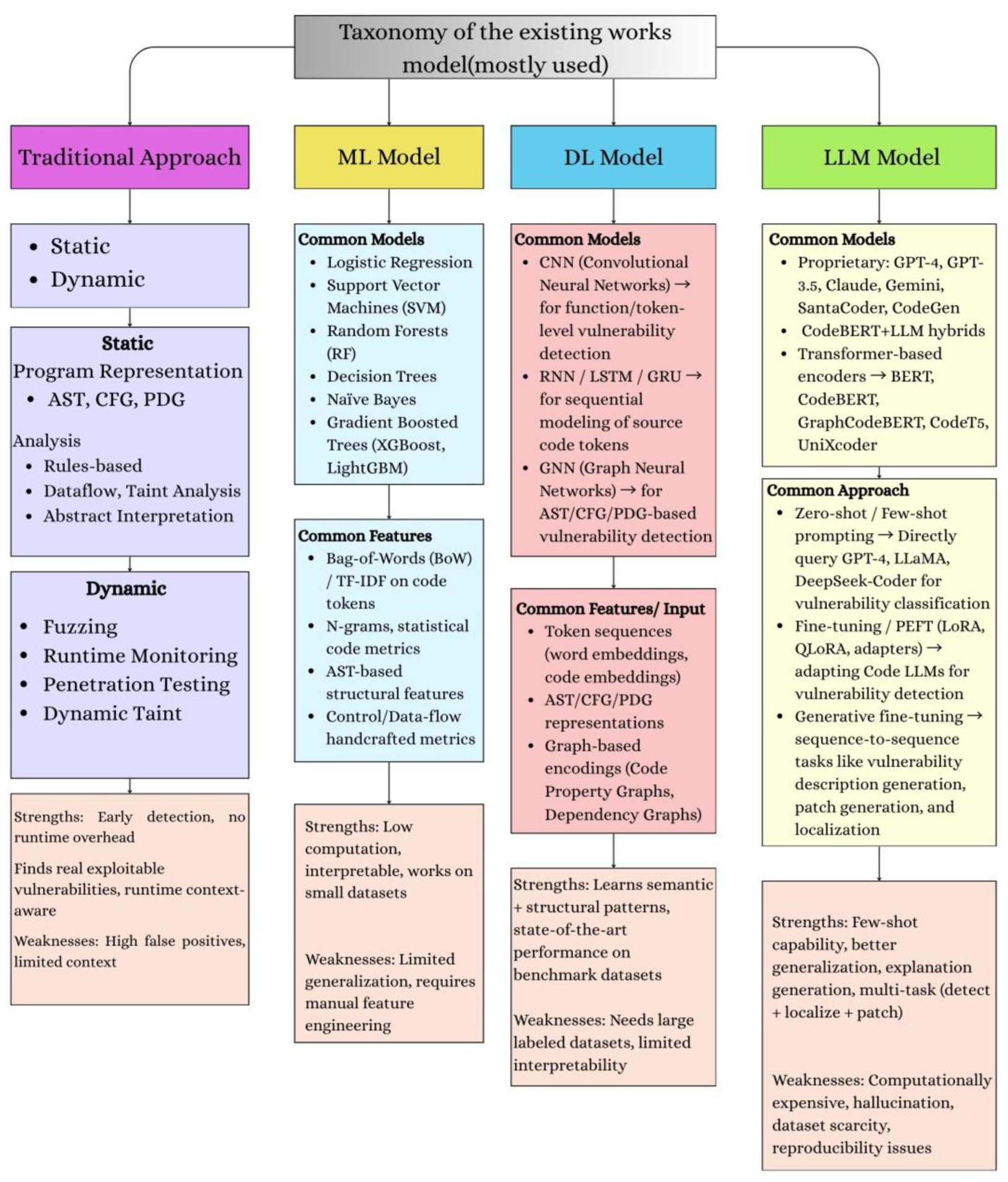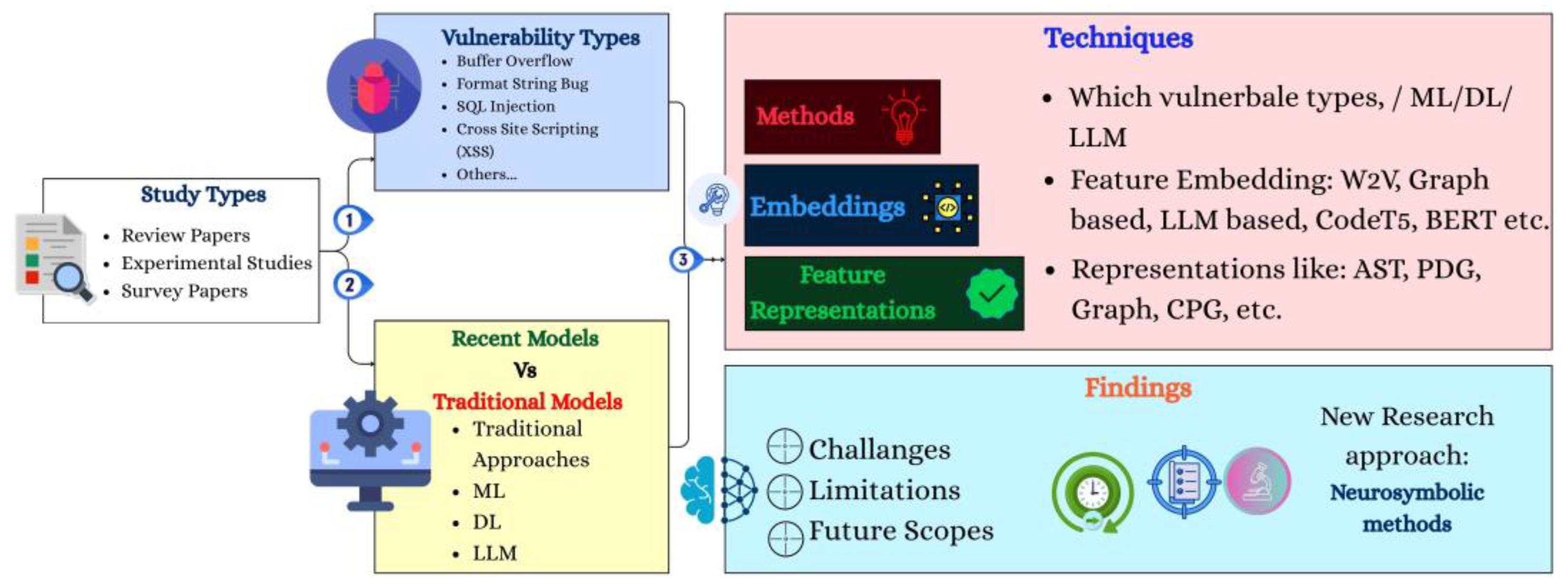 | Hanif et al. [30] | 2021 | Designed two alternative taxonomies for software vulnerability detection, one representing research interests and the other highlighting methodological methods. |