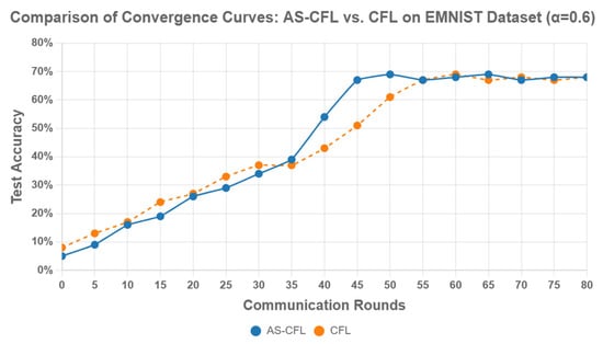 The convergence behavior of the AS-CFL and CFL algorithms on the EMNIST dataset (α = 0.6) is shown in Figure 2. The figure reveals two distinct learning patterns. The AS-CFL algorithm demonstrates a stable learning trajectory with a faster convergence rate, steadily improving its accuracy and reaching near-convergence in approximately 35-45 rounds via a sharp acceleration phase.
