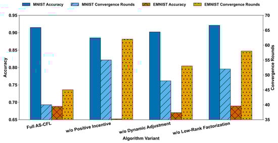 The results reveal that removing the positive incentive mechanism causes the greatest decrease in accuracy (3.4% on the MNIST dataset and 3.5% on the EMNIST dataset) and convergence speed (37.5% more rounds on the MNIST dataset), as it allows the inclusion of divergent clients, which degrades cluster quality. Without dynamic adjustment, the accuracy decreases by 1.7% on the MNIST dataset because of suboptimal cluster granularity in heterogeneous settings. Excluding low-rank factorization results in a marginal accuracy improvement (e.g., from 0.915 to 0.921 on MNIST), as the full similarity matrix provides more precise client relationship information. This is an expected finding. However, our core argument is that this tiny 0.6% accuracy gain comes at a disproportionately massive cost to efficiency (a 30% increase in required convergence rounds, from 40 to 52, as shown in the table). The purpose of low-rank decomposition is not to increase accuracy, but to make the clustering process computationally scalable. This highlights the critical role of low-rank approximation in balancing performance and computational scalability. These decreases demonstrate that each component is essential for AS-CFL performance, with synergistic effects enabling robust handling of non-IID data.