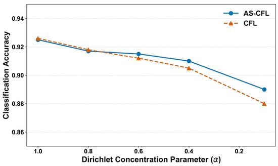 The results show two key trends. First, as expected, the accuracy of both algorithms degrades as heterogeneity increases (as decreases), confirming the challenge posed by non-IID data. Second, and more importantly, the performance of AS-CFL degrades more gracefully than that of CFL. At low heterogeneity (α = 1.0), CFL holds a marginal advantage (0.926 vs. 0.925). However, as the data skew becomes more severe, AS-CFL’s dynamic adjustment capabilities demonstrate their value. At = 0.6, AS-CFL surpasses CFL, and this performance gap widens further at α = 0.1, where AS-CFL leads by a significant margin (0.890 vs. 0.880). This analysis highlights the superior robustness of AS-CFL in highly heterogeneous environments, making it a more reliable choice for real-world scenarios where data distributions are highly skewed.