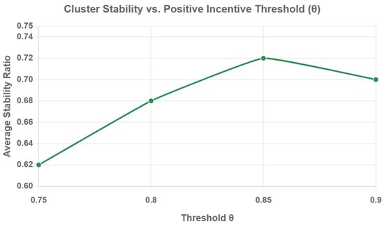 The positive incentive threshold θ is a key hyperparameter that determines whether a client is admitted into a cluster based on its performance contribution. To analyze its impact, we measure cluster stability, defined as the average Jaccard similarity of cluster memberships between consecutive communication rounds, at different values of θ. A higher value indicates more stable cluster formations over time.