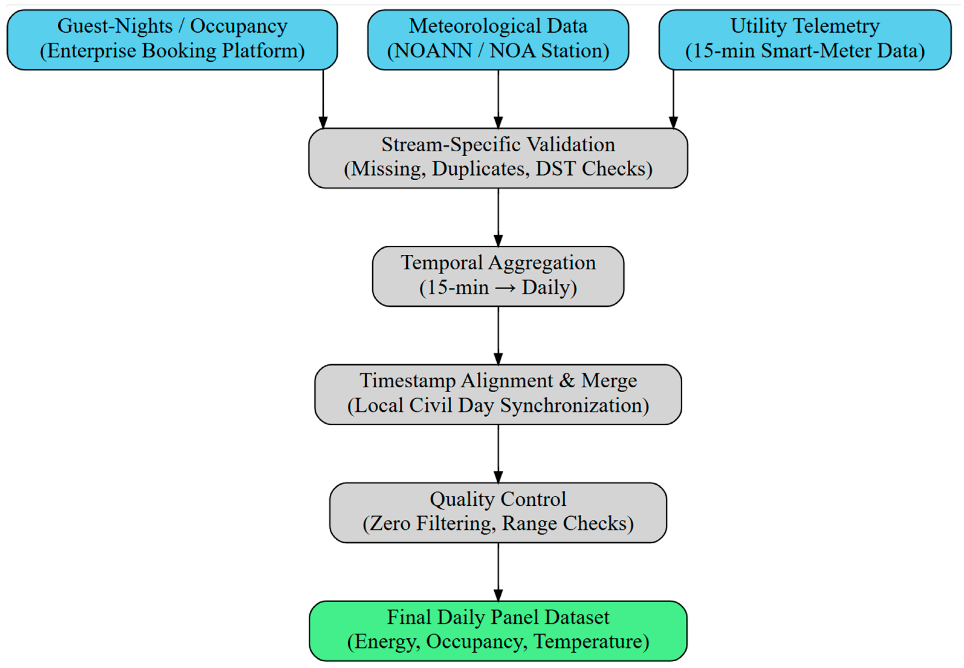 This section documents the acquisition, validation, and harmonization of the operational data streams used in the study. Three independent sources are programmatically ingested and aligned at the daily level: (i) distribution-operator meter telemetry (import active energy), (ii) enterprise guest-night counts, and (iii) near-surface meteorology (mean daily air temperature) from the NOA network.