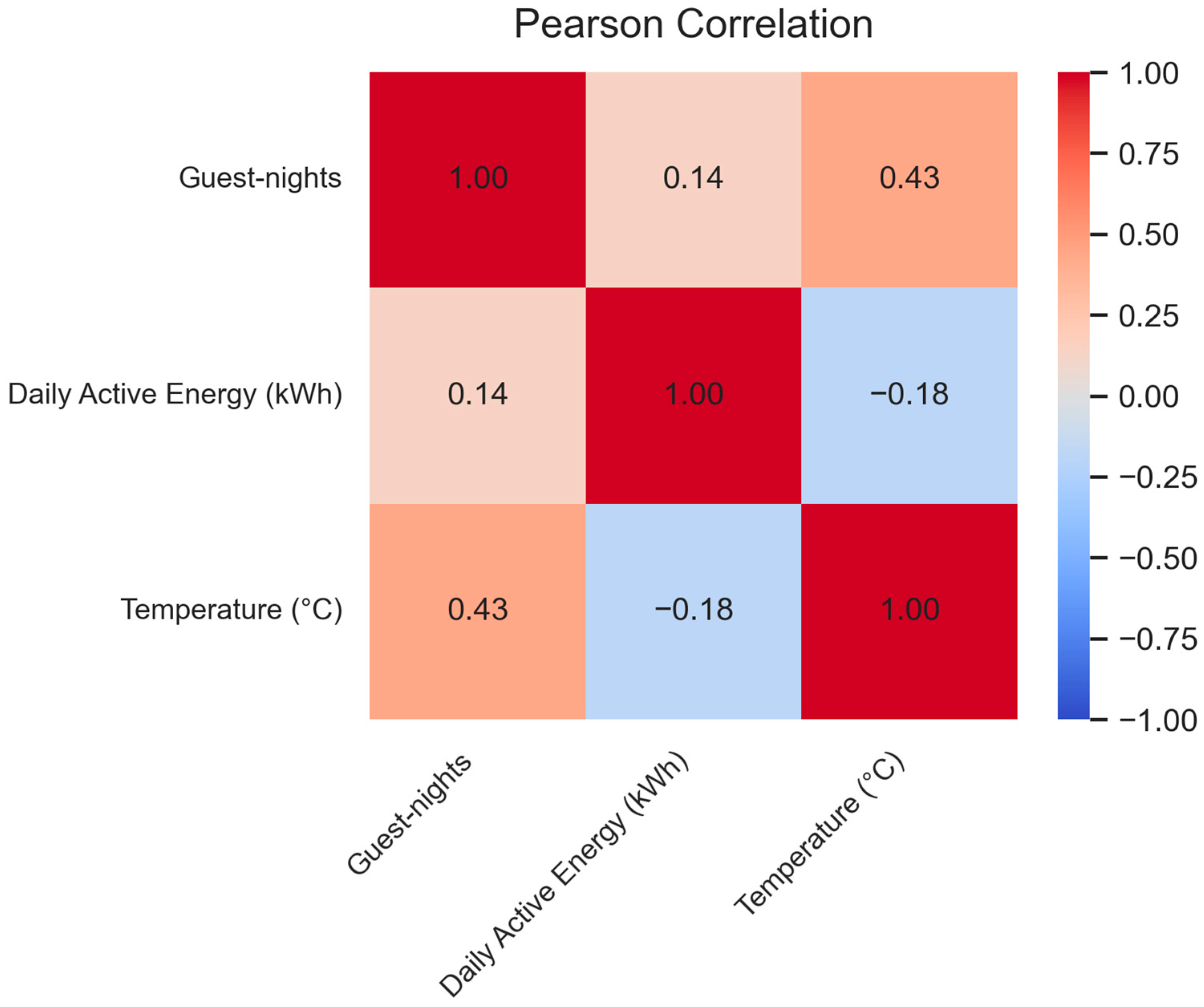 The correlation between energy and guest-nights is positive but modest (Pearson = 0.14), indicating that occupancy contributes to daily variability yet is not the sole driver—consistent with findings in real-time energy consumption studies that incorporate occupancy and weather [
