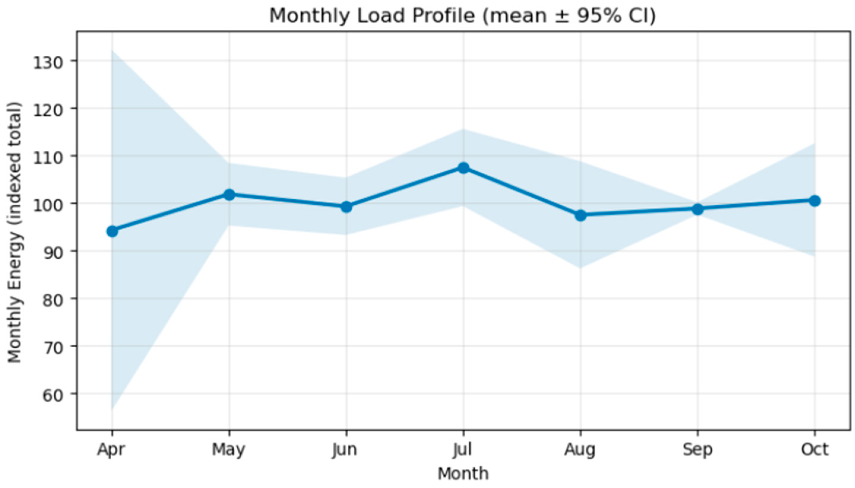 Figure 5 present the empirical profiles of monthly and day-of-week electricity demand, aggregated from the harmonized daily dataset. Both plots display mean values with 95% confidence intervals, derived from data within the April–October interval.