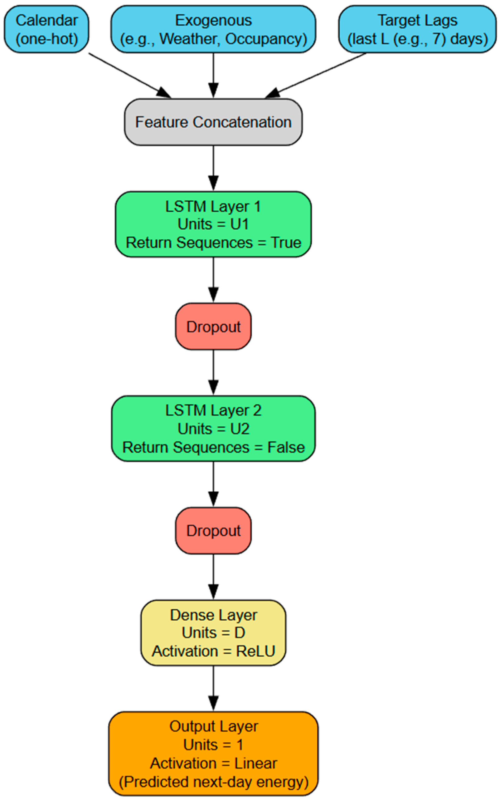 The modeling architecture combines sequential and contextual information to capture nonlinear dependencies between electricity use, occupancy intensity, and weather fluctuations. Input features include short target lags, calendar encodings, and exogenous variables (temperature and guest-nights), which are concatenated into a unified tensor and supplied to a two-layer recurrent neural network composed of stacked LSTM units.