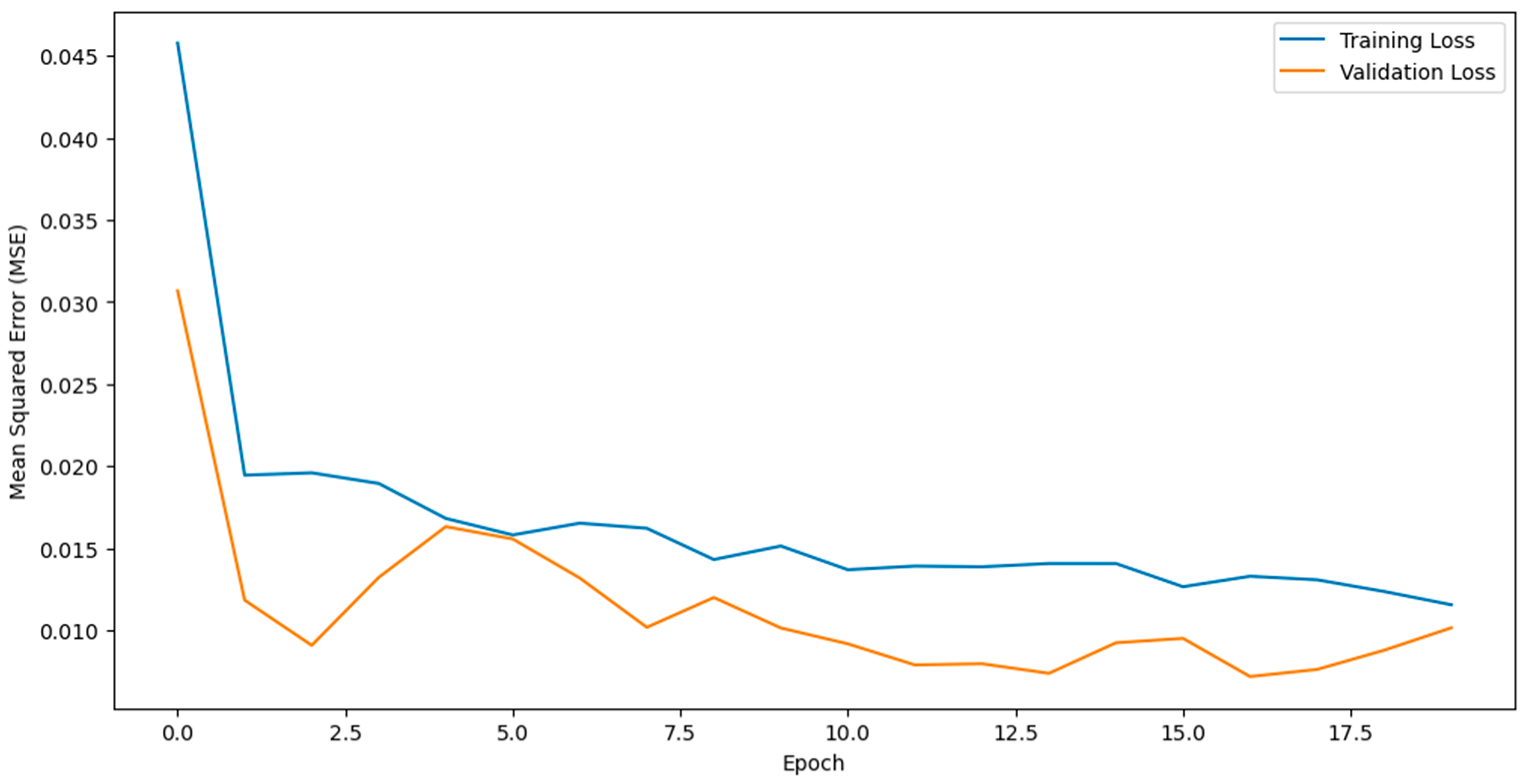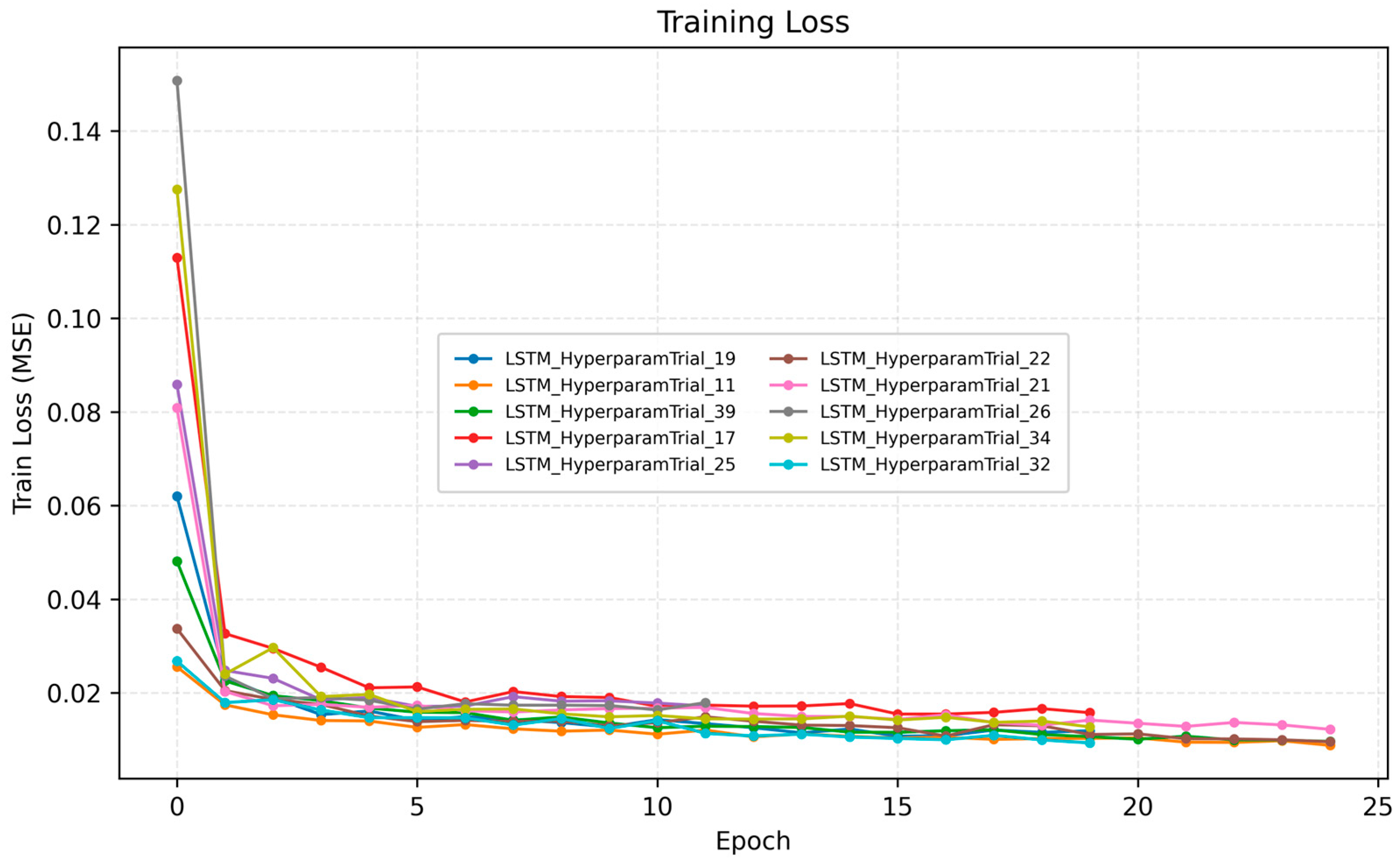 The model is compiled with the Adam optimizer, tested at learning rates of 0.001, 0.0005, and 0.0001. The training objective is the MSE, suitable for penalizing large deviations in forecasts. To prevent overfitting and accelerate convergence, early stopping is employed. Training is halted when validation loss fails to improve for 10–30 epochs, and the weights corresponding to the lowest validation error are restored. Reproducibility measures include fixed random seeds across all packages (NumPy, TensorFlow, Python random) and polite GPU memory allocation, which prevents monopolization of GPU resources while ensuring stable execution.