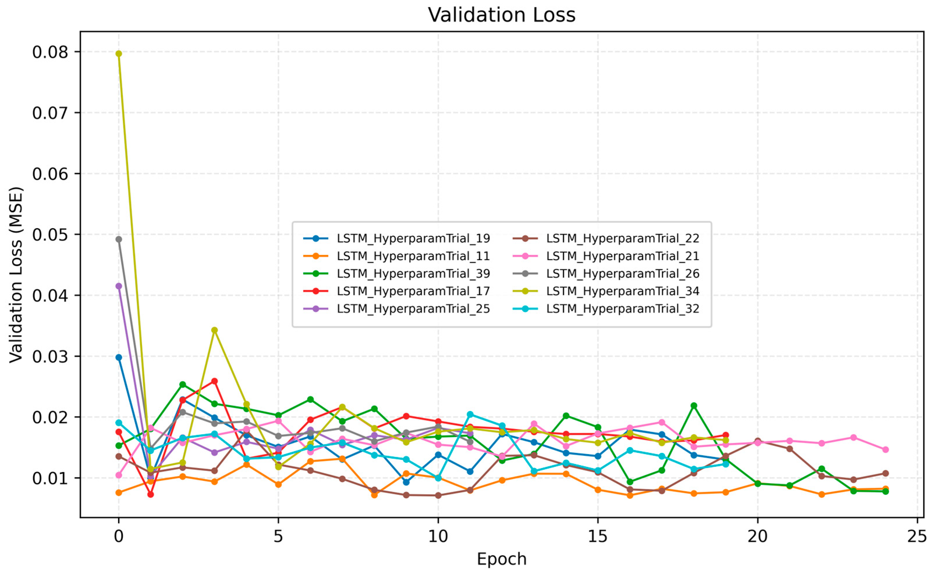 Best run—Trial_19 is the top performer with RMSE 4.71, MAE 3.48, and MAPE 3.29%. It uses look_back = 10, asymmetric recurrent widths (80 → 40), dropout = 0.1, dense1 = 32, batch_size = 32, epochs = 20 with patience = 10, and LR = 1 × 10−3. Tight clustering is evident because ranks 1–3 are within approximately 0.28 RMSE of one another, indicating multiple near-optimal settings. The effect of look-back is consistent: strong performers occur at L = 10 (ranks 1, 3, 4, 10) and L = 7 (ranks 2, 5, 6, 9), with L = 14 appearing at ranks 7–8; extending beyond 10 days did not systematically improve accuracy in this dataset. With respect to dropout, the best model uses 0.1; 0.2 appears consistently competitive (ranks 2–3, 7–8, 10); 0.3 tends to underperform slightly (ranks 4–6). Regarding layer widths, several top entries favor a wider first LSTM (80) followed by a narrower second LSTM (40–64), suggesting benefit from a rich temporal encoding followed by a consolidating layer. For the learning rate, 1 × 10−3 is prevalent among the strongest runs (ranks 1, 3, 6, 10), while 5 × 10−4 or 1 × 10−4 can also succeed depending on other settings. Trials 21 and 26 yield identical metrics with the same architecture and optimizer settings but different epoch/patience combinations, consistent with early-stopping dynamics.