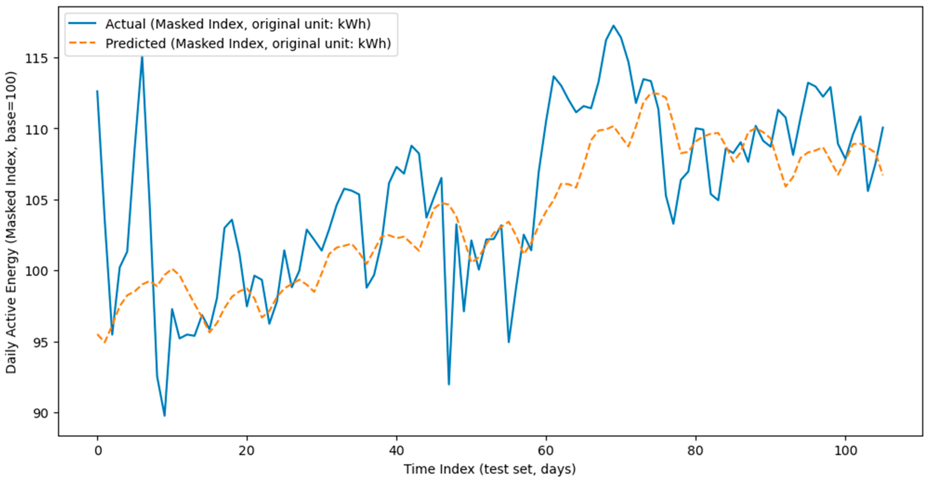 Overall, the results demonstrate that traditional regression and ensemble-based methods are capable of explaining a substantial portion of the temporal and exogenous variability in daily load, particularly the Random Forest, which performed comparably to the linear Ridge/Lasso regressors. However, the proposed LSTM achieved markedly superior accuracy, with RMSE = 4.71, MAE = 3.48, and MAPE = 3.29%, representing an improvement of approximately 42–47% in RMSE and 22–27% in MAPE compared with the strongest classical baselines. The LSTM also outperformed XGBoost 3.0.0 and ARIMAX by more than 50% and 60% in RMSE, respectively, confirming the limitations of tree-based and autoregressive models in capturing long-term nonlinear dependencies. These consistent gains underscore the LSTM’s capability to model sequential dynamics and complex interactions among occupancy intensity, temperature, and calendar effects that remain only partially accessible to static or weakly autoregressive frameworks. Furthermore, the use of uniform masking, schema standardization, and MLflow-based tracking ensures full methodological transparency and reproducibility, establishing the LSTM as both a technically robust and operationally auditable solution for hotel-scale energy forecasting.