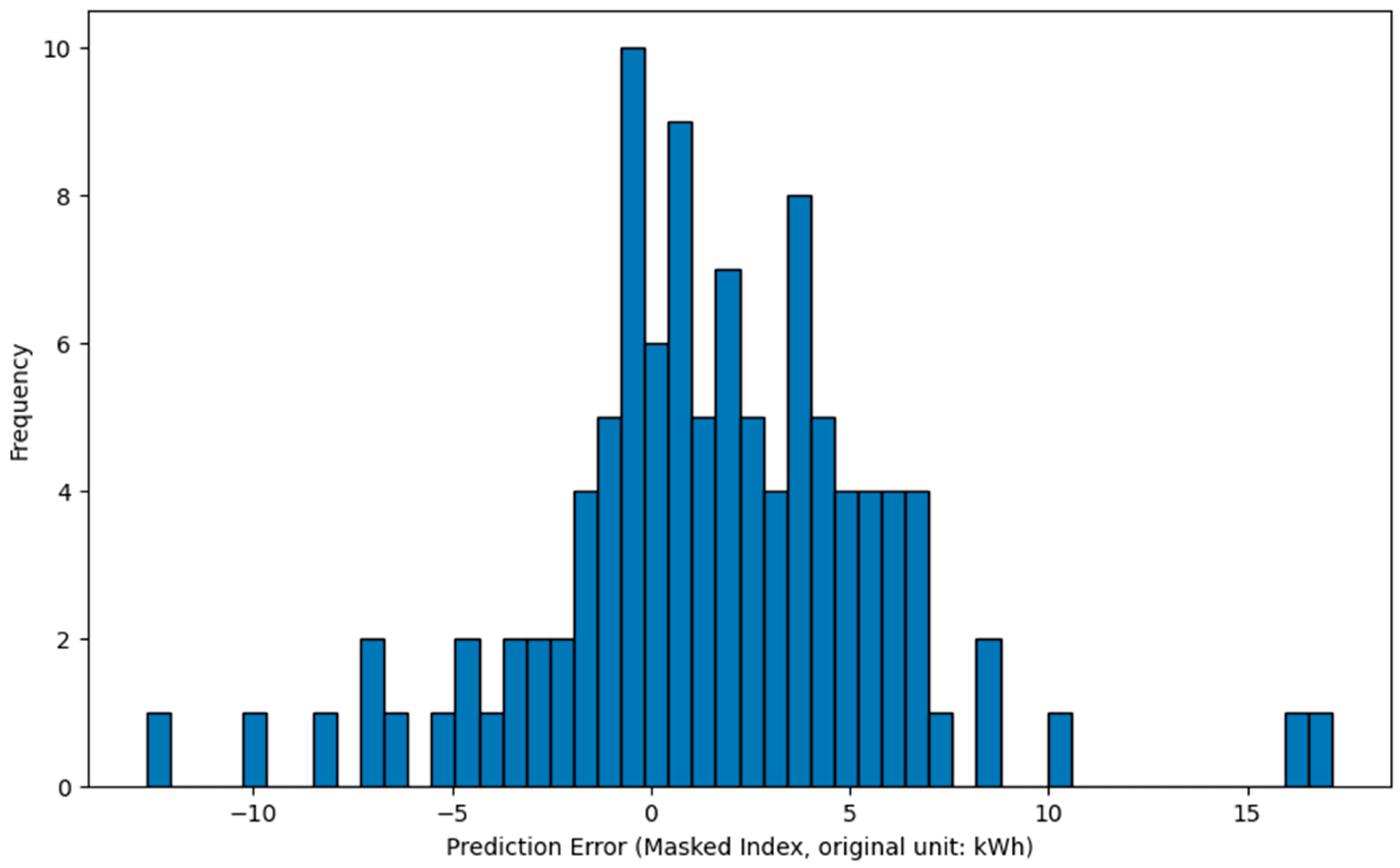 To move from exploration to performance ranking, every configuration was assessed on the hold-out test span using a consistent, leakage-safe protocol. We prioritized RMSE (7) as the primary selection criterion, reflecting sensitivity to large deviations that matter operationally in kWh, calculated as follows: