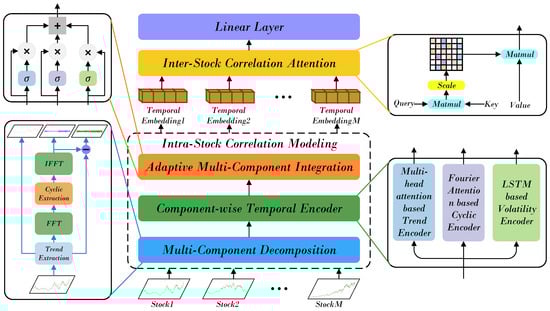 First, the Multi-Component Decomposition Layer decomposes each stock time series into three distinct components: trend, cyclic, and volatility. The trend component captures the overall long-term direction of stock movements, the cyclic component represents periodic behaviors occurring at different frequencies (such as daily or weekly cycles), and the volatility component models irregular short-term fluctuations that cannot be explained by the other two components. This decomposition allows the model to better capture the complex temporal relationships within each stock (intra-stock temporal dependencies). Second, the CTE models each component separately to capture its specific temporal dynamics. The trend component is processed by a Transformer encoder to capture long-term dependencies, the cyclic component is modeled using frequency-enhanced attention to capture periodic signals, and the volatility component is handled using normalization (RevIN), a multilayer perceptron (MLP), and a recurrent unit (LSTM) to represent nonlinear short-term dynamics. This enables the model to model the complex temporal dependencies within each component (intra-stock dependencies). The AMCI module dynamically fuses the learned component representations through adaptive gating weights, allowing the model to adjust the contribution of each component over time. Finally, the ISCA mechanism models the inter-stock correlations by capturing dependencies among multiple stocks through multi-head attention, learning the inter-stock relationships and co-movements in the market.