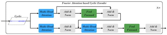 As illustrated in Figure 3, the Cyclic Component Processing Module aims to learn periodic regularities within stock behavior. Starting from the cyclic component obtained through decomposition, Fourier Attention (FA) [24] is employed to enhance modeling of frequency–domain characteristics, enabling effective detection of recurring cycles and harmonic patterns. By operating in the Fourier domain, FA transforms temporal correlations into spectral representations, where periodic information can be expressed more compactly through dominant frequency components. This frequency-domain processing allows the model to capture periodic dependencies without relying solely on local temporal correlations, overcoming the limitations of purely time–domain attention.