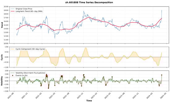 This multi-scale decomposition strategy enables the Multi-Component Decomposition Layer to disentangle stock time series into interpretable components, effectively capturing long-term trends, recurrent cycles, and rapid fluctuations. The resulting representation offers a more structured and informative foundation for subsequent temporal modeling and correlation learning. Specifically, the trend component reflects the long-term evolution of stock prices, representing the company’s fundamental growth and overall market perception. The cyclic component captures periodic patterns that often emerge in sectors sensitive to commodity or energy prices—such as mining, coal, and oil—where market movements exhibit clear cyclical behaviors. In contrast, the volatility component characterizes short-term price fluctuations, whose analysis helps mitigate the influence of transient noise on prediction and trading strategies, leading to more stable and realistic forecasting outcomes.